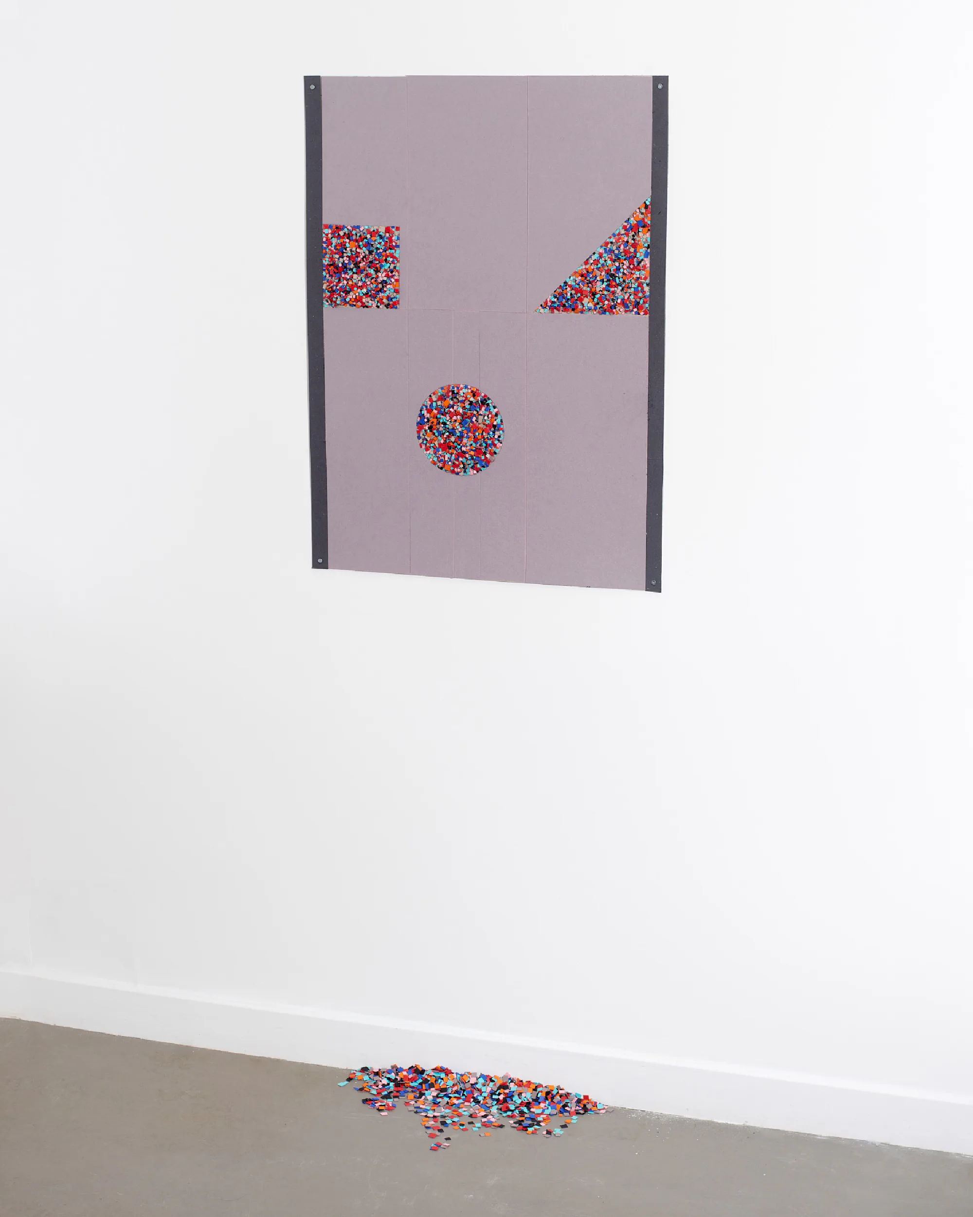 A 2D emoji made of 3D noise. A circle; a triangle and a square - each measure the same area². Apparently unshaped noise occupies floorspace in a pile against the skirting board.